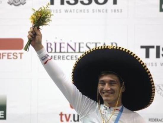 In Mexico stand die gesamte Weltelite am Start des Omniums. 24 Sportler, die besten Vielseitigkeitsfahrer aus 24 Nationen, mit dem amtierenden australischen Weltmeister O`SHEA, dem Europameister dem Italiener Viviani an der Spitze, konnten seinen zweiten Welt-Cup Erfolg nicht verhindern. Am Samstag begann dieser Rad 6 Kampf mit dem „Scratsch“ Rennen über 10 km. Hier konnte er mit dem 4. Rang schon wertvolle Punkte holen, Im zweiten Rennen, dem 4000m Zeitfahren überraschte er nicht nur mit einer „Superzeit“ von 4.22.8 (pers. Bestzeit) sondern auch mit dem 2. Platz hinter dem USA Boy Bobbi Lea. Die dritte Disziplin, das Ausscheidungsfahren, dies ist seine „Hassdisziplin“, überzeugte er mit dem 3. Platz. Damit beendete er den 1. Tag auf Platz 1 mit knappen 16 Punkten Vorsprung vor dem Weltmeister Glenn O`SHEA.